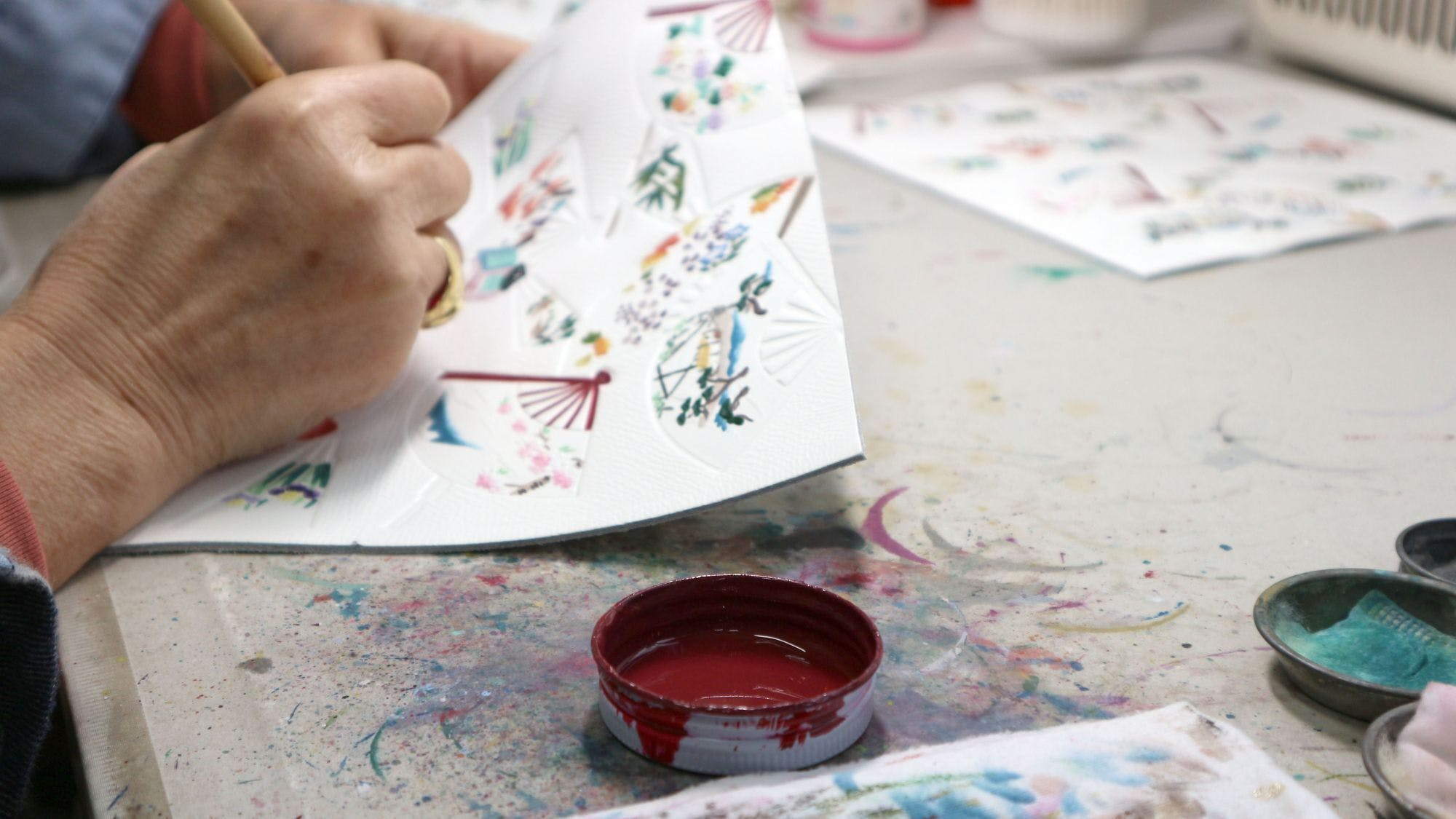 型押しをして、凹凸のついた革には、職人たちが一つ一つ筆で『彩色(さいしき) 』を施していきます。筆で表情を与えながら、革に色をのせていくのですが、この段階では、絵柄のアウトラインは型押しの凹凸以外、見えません。