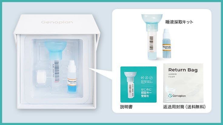 検査における注意事項:本遺伝子検査は医療行為に該当しないものであり、検査結果は診断ではなく、医師の診断内容や処方箋を置き換えるものではありません。現在医師の診療を 受けている、もしくは将来的に医師もしくは専門家の診療を受けた場合には、医師・専門家の指導を優先してください。また、本サービスは遺伝子解析結果お よびアンケート結果を基にしてジェノプラン独自のアルゴリズムにより算出したものであり、医療情報等は含みませんので予めご了承ください。