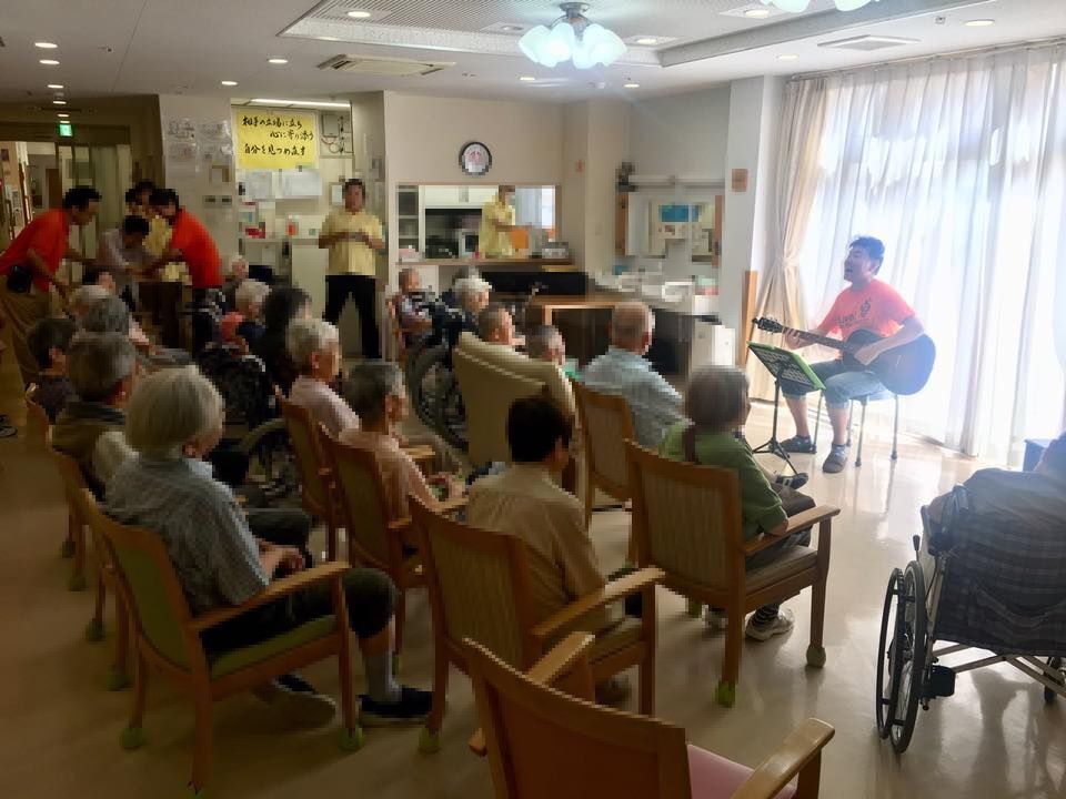 Live! Do You KYOTO?実行委員会は環境についての啓発活動が主な事業ですが、地域の方々と繋がる活動として、代表でありミュージシャンの秋人が、老人ホームや介護施設の利用者さんに音楽を届ける活動もしています。夏祭りやクリスマスなど、施設職員さんが準備されたイベントへ参加させて頂き、事前のリクエストなどを参考に選曲し、歌わせて頂きます。利用者さんの年代に合わせて、懐かし歌謡曲や童謡を歌うと、一緒に歌ってくれたり、中には立ち上がって踊ってくれる利用者さんもいます。ほんとうに楽しそうに大きな声で一緒に歌っている方や、時には昔を思い出されるのか涙ぐむ方もいます。音楽はいろんなシーンを蘇らせる力があるようです。そして、何より元気になって頂けるようです。秋人がお邪魔するのを心待ちにして頂いているそうで、年に数回の出会いなのですが、覚えてもらっているのは、とても嬉しく思います。笑顔で迎えてもらえることに感謝です。そんな高齢の方とのふれあいも、新型コロナウィルスの影響で施設へ伺うことはできなくなりました。非常事態宣言は解除されましたが、利用者の皆さんと歌える日は、まだやってきそうにありません。クリスマス会はお会いできるといいですね。ネット配信やテレワークでは解決できないコミュニケーションが、やはりあると思います。施設職員さんのお仕事もそんな大切なお仕事の一つです。職員さんを応援し、利用者の皆さんと少しでも寄り添えるように、微力ですが私達も頑張って活動を続けていこうと思います。一日も早く、事態が収束し日常の生活が戻りますように。皆さんにまた、音楽が届けられますように。