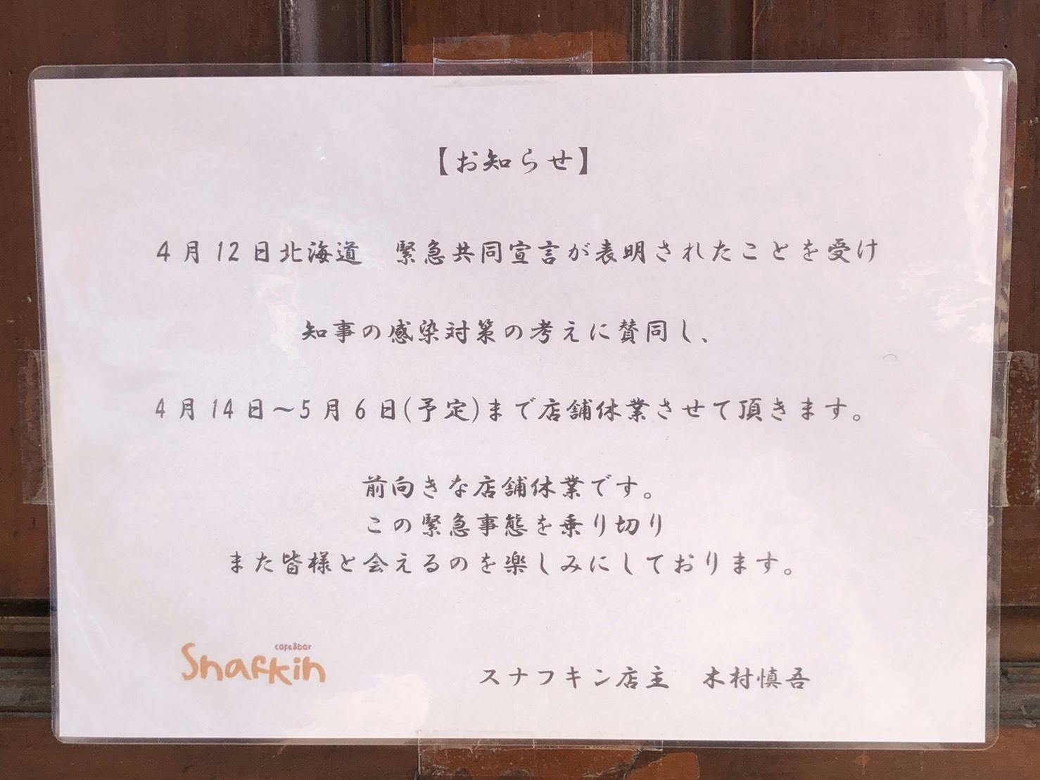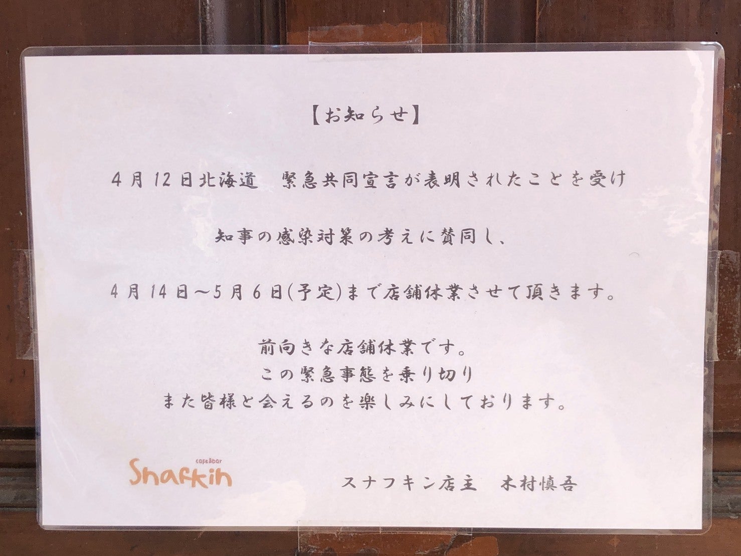 4月12日北海道緊急共同宣言が表明されました。札幌を中心とした宣言ですが、北海道全域が対象、夜の飲食繁華街は外出制限などいよいよ自分のお店は通常営業することが困難になりました。そして4月14日、スナフキンは再度休業としました。