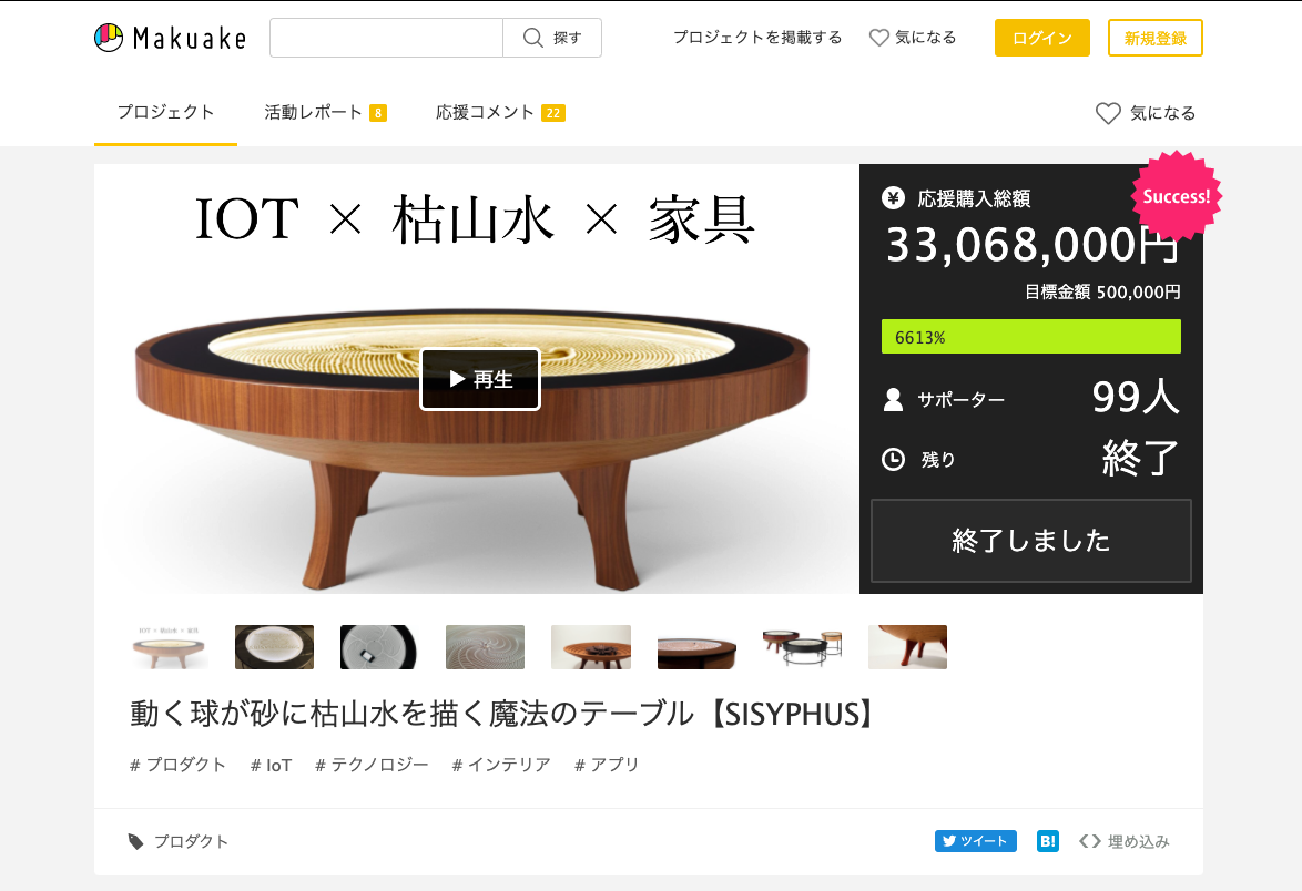 2020/07/30 11:49この度は、キネティックアートテーブル「Sisyphus」にご支援いただきありがとうございます。ギズモードにて記事を書いて頂きました!「8%オフ終了間際! 支援額300万円を突破した、魔法のようなテーブル」https://www.gizmodo.jp/2020/07/217388-machi-ya.html見ているだけで癒されるテーブルの支援期間はあと10時間ほどとなりました。お安い買い物ではありませんので、なかなか購入に踏み出せない方も多いこととは思います。。。この活動レポートを書いている私の家では鉄球がアートを描き続けてくれていて、リモートワークの癒しになってくれております。電源を入れた時の「わあ」という感動を一人でも多くの方に届けたいと思います。ぜひご家族でじっくり考えていただき、価値が感じられるようでしたらご支援をお願いします。今回は見送られた方も、このレポートを読んでくれて本当に有難うございます。引き続きの応援宜しくお願いします。株式会社Earth ShipSisyphusプロジェクトチーム吉村 もっと見る