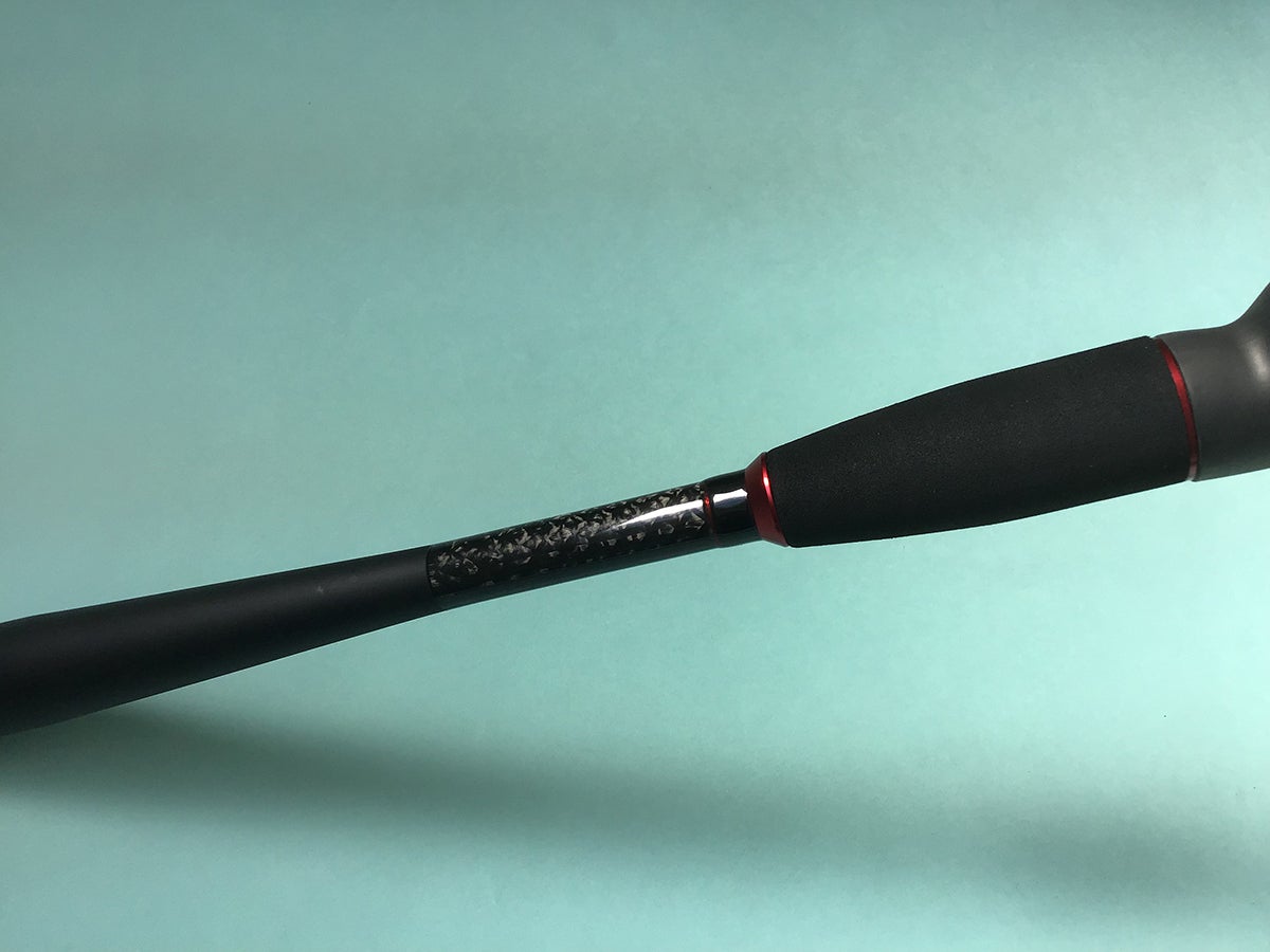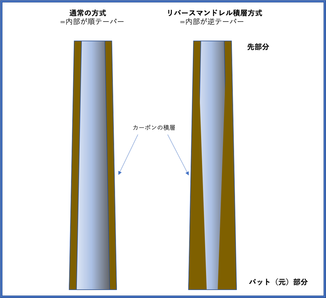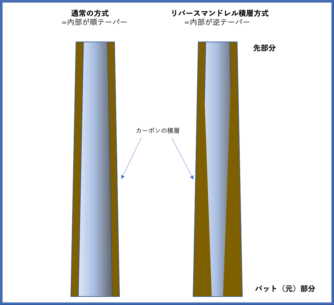 通常竿の内径は先端側が細く、元側に行くと太くなっています。2ピース構造の当製品は、バット部でマンドレルを逆さまに使用。肉厚の変化で竿の内側に逆向きのテーパー形状を作っています。