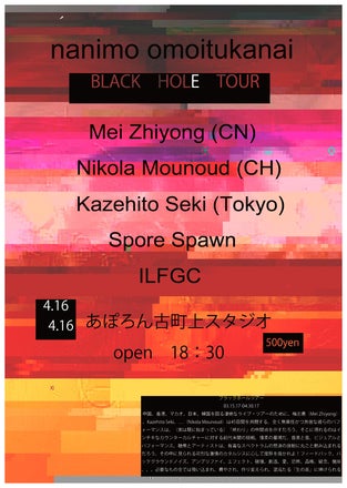 初めまして。今回の企画「nanimo omoitukanai」は、新潟在住のノイジシャンSpore SpawnとサーキットベンダーILFGCの2名での共同企画となり、現在BLACK HOLE TOURでツアーを回られているアーティストの新潟での公演を予定しています。