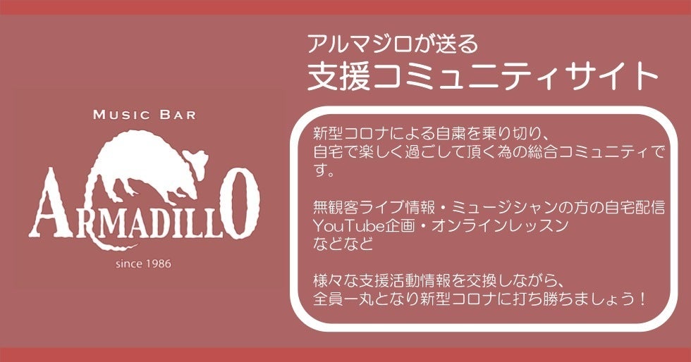 この度は、数多くの皆様のご支援を頂き、改めまして誠にありがとうございます。昨日5月19日(火)、当プロジェクトの目標額を達成致しました!ご支援を頂きました沢山の方々に、改めて心より感謝申し上げます。本当に本当に、ありがとうございました!!先日、緊急事態宣言は一部解除されましたが、依然としてライブハウスの自粛は続いており、当店も通常通りのライブ営業させて頂くまでには、まだまだ時間がかかるのが現状です。飲食営業を再開しても、皆様が足を運び辛い現実は続くと思われますので、当分の間、現金不足と戦っていかなければなりません。そして新型コロナ感染の第二波や第三波が危ぶまれていて、まだまだ予断を許さない状況ですが、当店は、ライブ営業が出来ない間もテイクアウト、飲食営業など、出来る事を精一杯頑張って参ります。何卒引き続き応援を頂けましたら幸いでございます。また改めまして、皆様のおかげで当初目標額の400万円を無事達成する事が出来ました事、心より感謝申し上げます。無事に目標達成致しました400万円の殆どは、既に発生から4ヶ月となる維持経費とリターンの経費として、大変有り難く活用させて頂きます。そして改めましてこれからは、目標額達成後の第三の目標でございました「配信技術の普及活動」にも努めていきます。当店が培った「低予算でのライブ配信技術」が少しでも他店様含め皆様のお役に立てればと思いますので、ここからのご支援金で何とか普及活動を維持出来ればと思います。そして当然、当店を含めた音楽関係者だけでなく、様々な業種の方々が痛切に限界を訴えておられます。当店が今出来る事は、支援情報の拡散・共有する事で、微力ながら一人でも多くの方々の支援に繋がればと思っております。その一環として、新しく立ち上げた「支援コミュニティサイト」にて、なるべく多くの支援情報や、出演者様の活動などを取り上げさせて頂いております。ライブ営業が出来ない期間も、「音楽の憩いの場」として、サイト内で出来る限り皆さんに楽しんで頂けるようなコンテンツをお届けして参ります。http://community.armadillo.nagoya/つきまして、以降のご支援金は、当初の公約通り、配信技術普及による他店様のサポート活動、そしてコミュニティサイト運営による様々な支援応援活動の活動維持とそれにおける当店の経営維持の費用として慎重に扱わせて頂きます。(後日詳しくストレッチゴールの目標等を掲示させて頂きます。)この先も新型コロナ第二波、第三波の恐怖は続き、更なる厳しい現実に直面する事と思います。当店を含む、配信ライブを活用され必死に生き延びようと努力される音楽施設様、ライブが出来ない中でも楽しい音楽と時間を提供すべく活動されるアーティストの皆様、そしてコロナと必死に戦われる全ての業種の皆様、その全ての皆様の応援を込めて、引き続き当店の活動を見守って頂ければ幸いです。そしてまた、もし当店の「配信活動」「普及活動」「支援の輪を広げる活動」を応援頂けましたら引き続き当プロジェクトを拡散して頂ければ誠に光栄に存じます。当店にとりまして、当面続くであろうライブ営業の自粛を乗り切るには、まだまだ高い壁です。これからが本当の意味での真剣勝負で、まだまだ闘いは終わらないと思われます。気を抜かず、この事態を皆様と共に、乗り切って参りたいと考えております。本当に本当に多くのご支援を、誠にありがとうございます!引き続き、新型コロナの一日、一時でも早い収束を心から願い、皆様のご無事と健康をお祈り申し上げます。店主 岩尾アルマジロスタッフ 一同