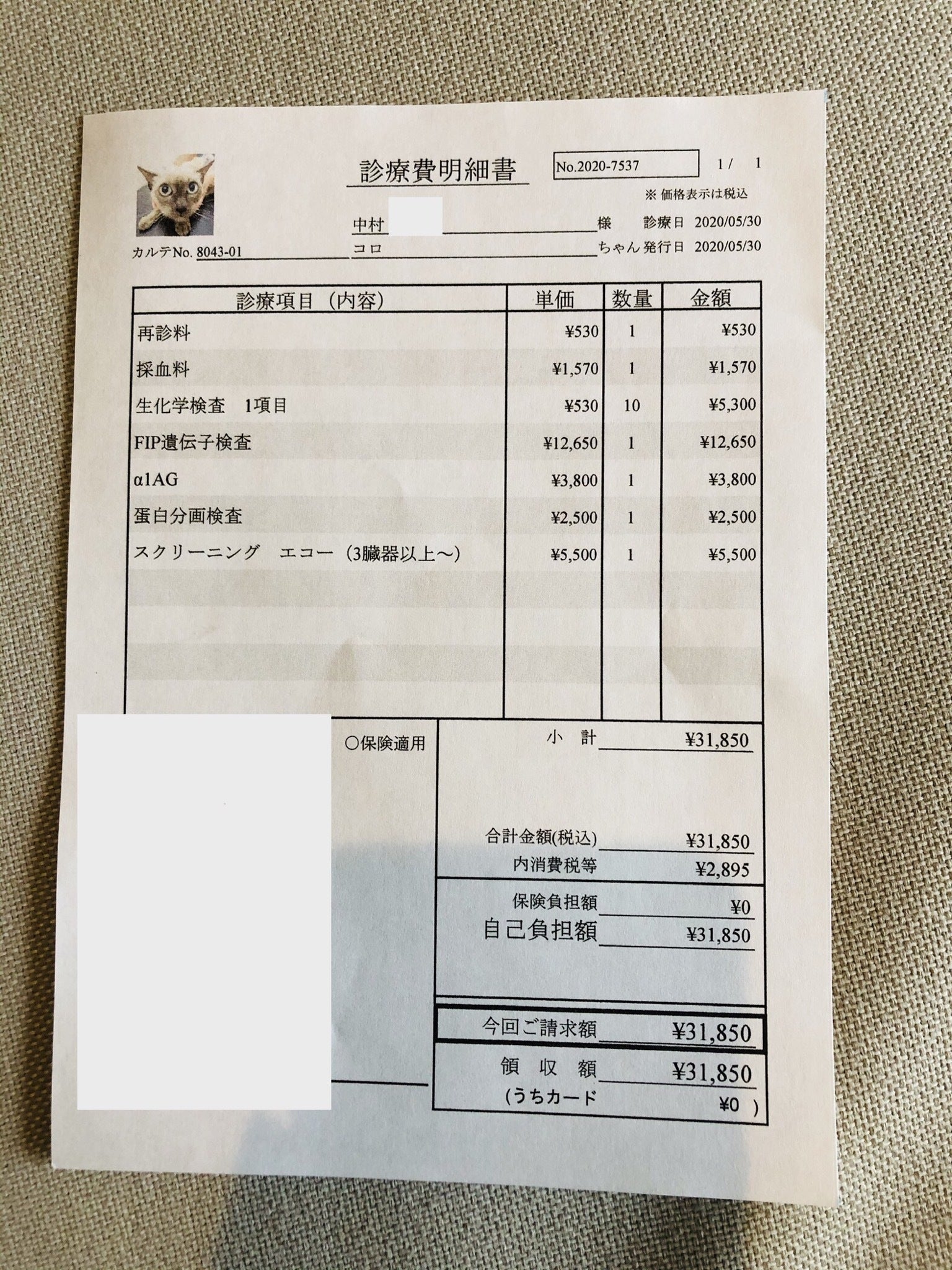 この日の診療代は31,850円でした。