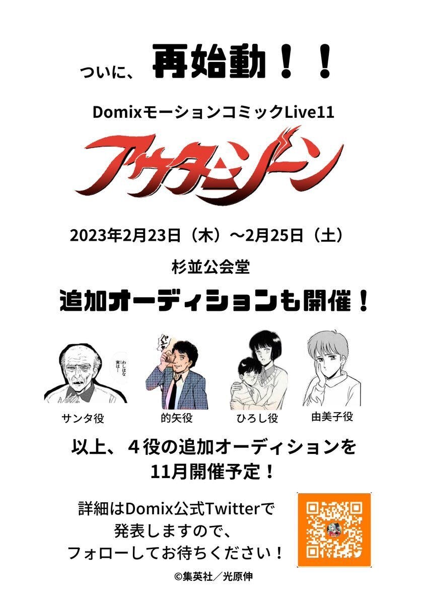 2022/10/26 19:13長らくお待たせしました!理想的な劇場を押さえることができず、本当に長くお待たせしてしまいました。新しい代表がずっと諦めることなく毎月抽選に出かけた末にようやくです!Domix11アウターゾーン!ついに劇場が決定いたしました! 公演日程:2023年2月23日(木)〜25日(土) 劇場:杉並公会堂(荻窪駅から徒歩5分)そして延期によって出演叶わなくなった役者さんの役の追加オークションも行われます。11月18日(金)/19日(土)の二日間です。 詳細は下記ページにございますので…支援された方の中に役者さんいらっしゃったら、是非ご応募もお待ちしております! →http://domix.liveお知り合いにいい役者がいるぞって方も是非ご紹介ください。どうぞよろしくお願いいたします! もっと見る
