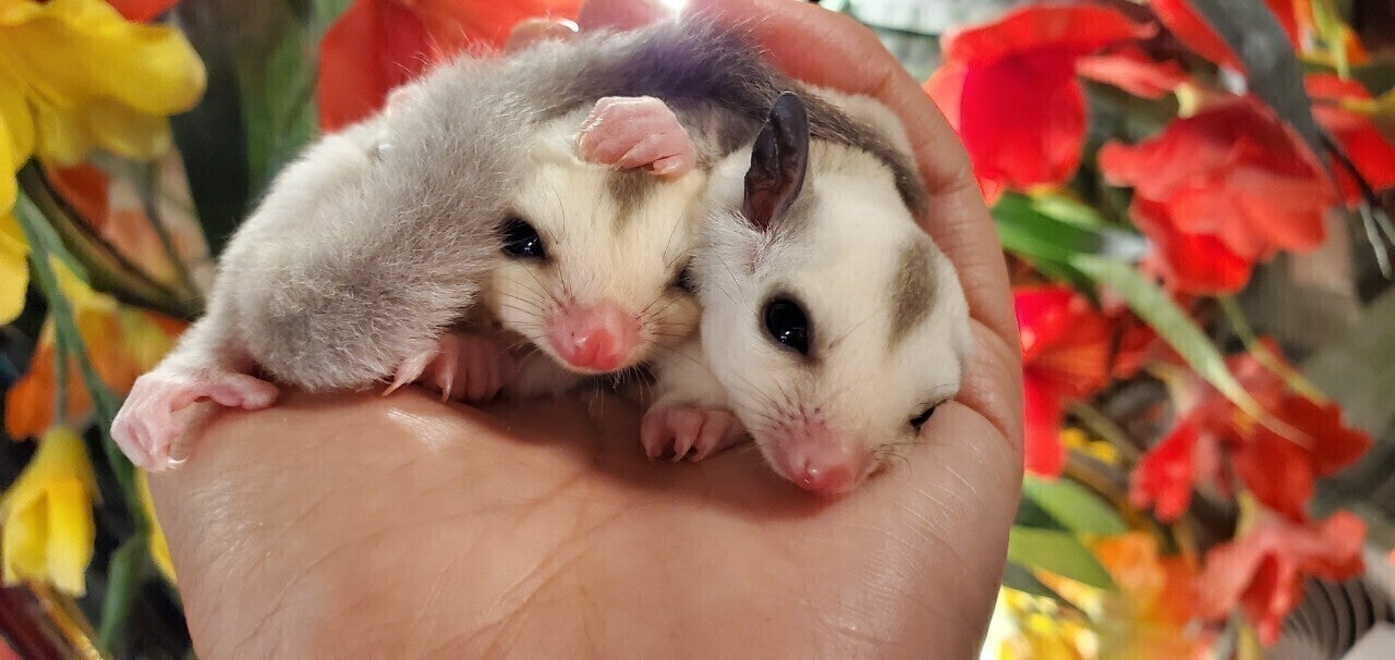 手の中で落ち着くフクロモモンガの双子の赤ちゃん