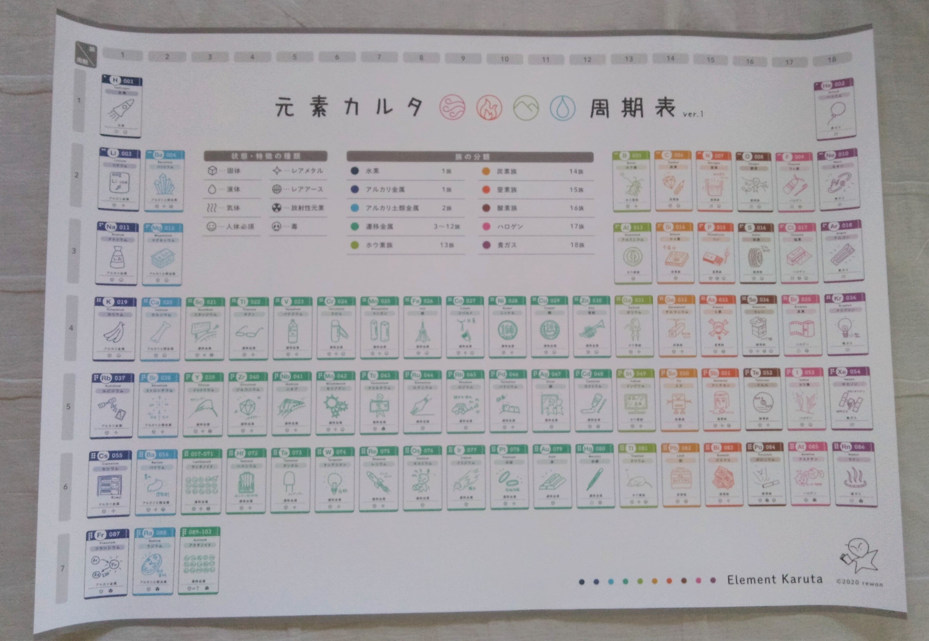只今「元素カルタ」を製作中ですが、レウォンの新たな発案で、【元素カルタ周期表ver.1 】を作ってみました!「元素カルタ」の絵札一札を周期表状にまとめて、ポスター(ver.1 ) にしました。 周期表のカタチで、ポスターになるとまたイイ!!レウォンの目指す、シンプルなこの感じがまたイイ!!「元素カルタ」を一目で見ることができるので、またまた分かりやすくイメージしやすいのが特徴です。サイズはA1。小学5年生が持つと、このくらいの大きさ(イメージ)。今後この半分のA2サイズ(トイレなどにも貼って学べる?)で、一札(ver.1 )、二札(ver.2)、三札(ver.3)それぞれのポスターも作れたらいいなと思っています。ポスターにご興味ある方は、メールでお知らせください。polarewon@gmail.comさて、肝心な「元素カルタ 」の方ですが、只今印刷会社様が一生懸命に製作してくださっています。印刷会社様が印刷工程を送ってくださいました!できてるできてる・・・もうしばらくお待ちください。