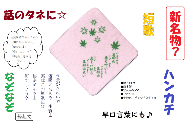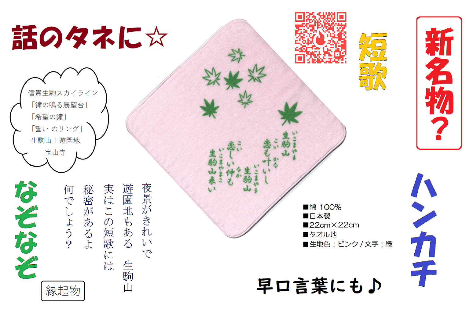 この度「オリジナル・地名回文短歌ハンカチ 」を制作し、奈良生駒のノベルティ、おみやげの定番として展開させたく思い、応募いたしました。