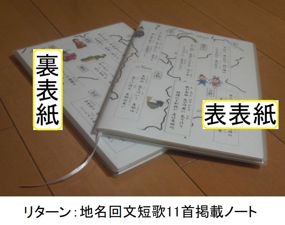 ・特製ノート。西宮、豊中、伊丹、八尾、高槻、 島本、寝屋川、枚方、交野、生駒、竜田川の地名を織り込んだ、「地名回文短歌・11首 」を表表紙と裏表紙に掲載したノート(A5版)♪ 書籍ではありません。中身は何も書かれていないノートですのでお間違えなきようよろしくお願いいたします。