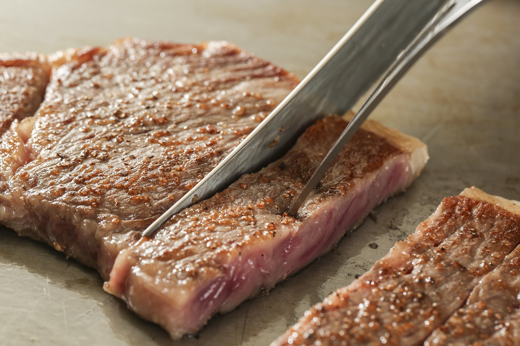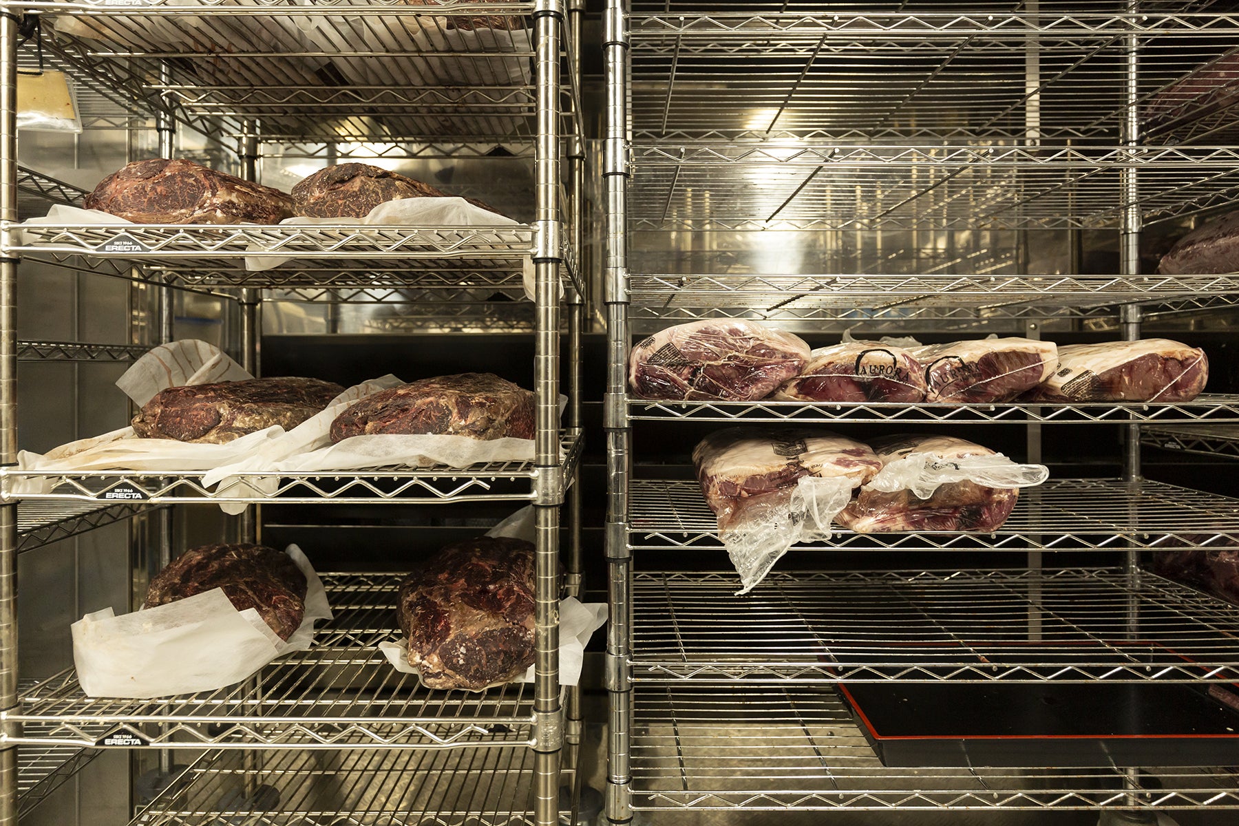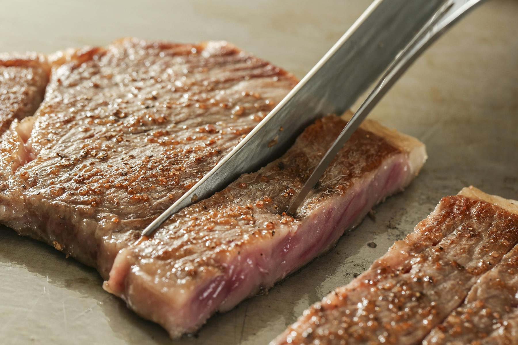お肉を240 時間以上0℃熟成させると、旨味が凝縮され、やわらかくなります。0℃熟成肉は焼いても肉汁が出ません。噛んではじめて肉汁があふれ出すんです。多くの人は「熟成肉は黒毛和牛で高価。特別な日に食べるもの」というイメージがあると思います。当店のリブロースはなんと350 グラムで3,434 円…、かなり破格です。当店は、ステーキにぴったりのブラックアンガス牛のチョイスランク(最高級)を提供しています。しかし、0℃熟成法はロスがないので、この価格でお届けできます。“安くて旨い”は大阪の飲食業者にとって最大のほめ言葉です!しかも、食材ロスにも有効。私はなにわの商人…、つまりはケチなので、捨てる部分があると「アカン、もったいない」となる(笑)。だからこの技術をみんなに知ってもらいたいんです。
