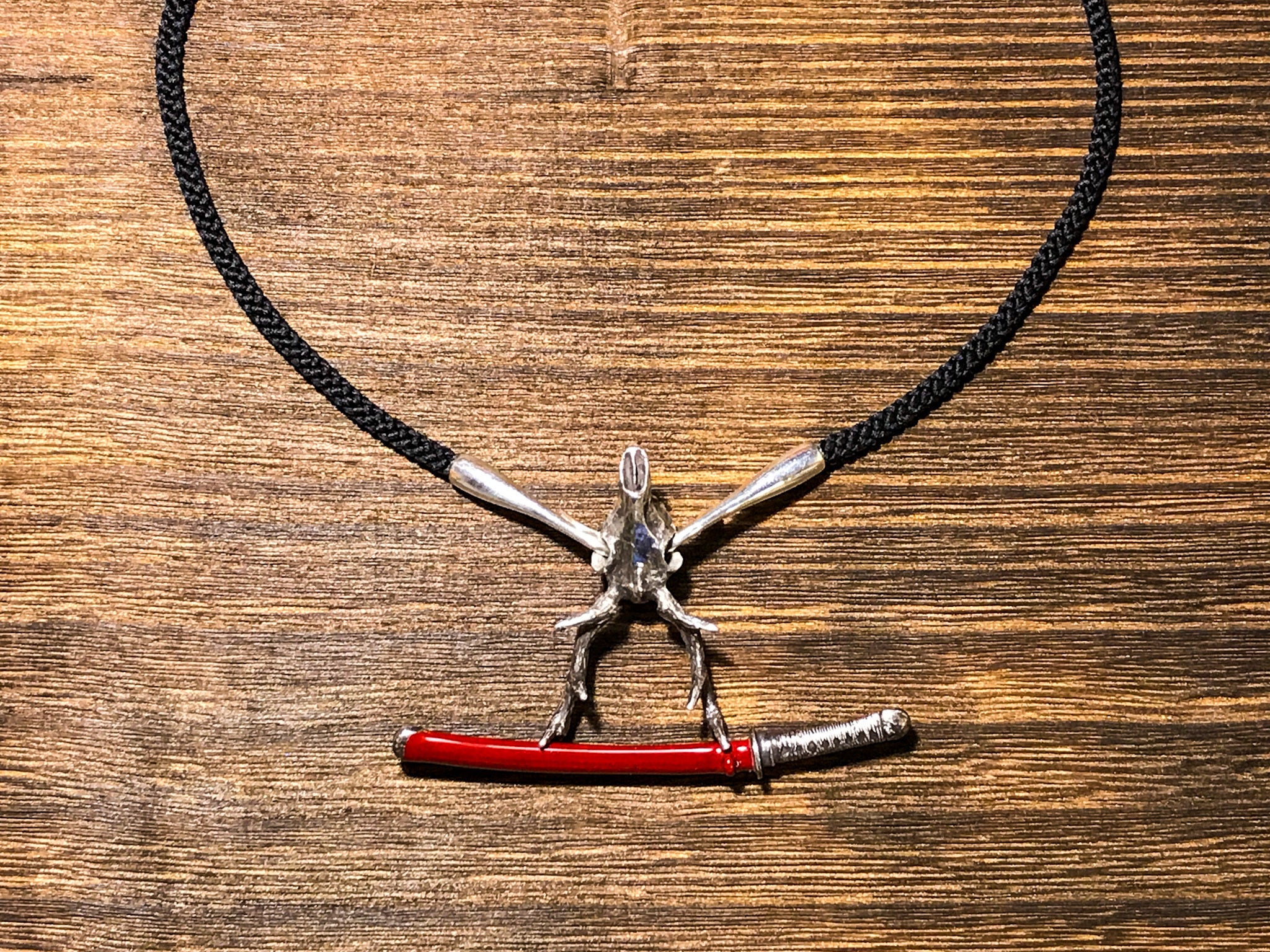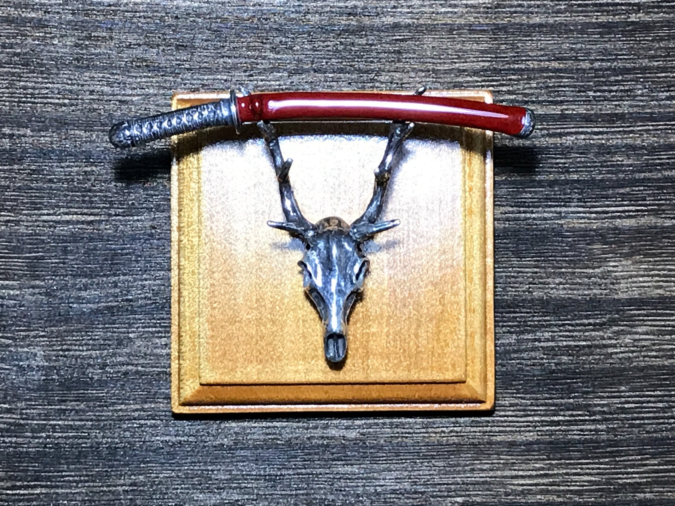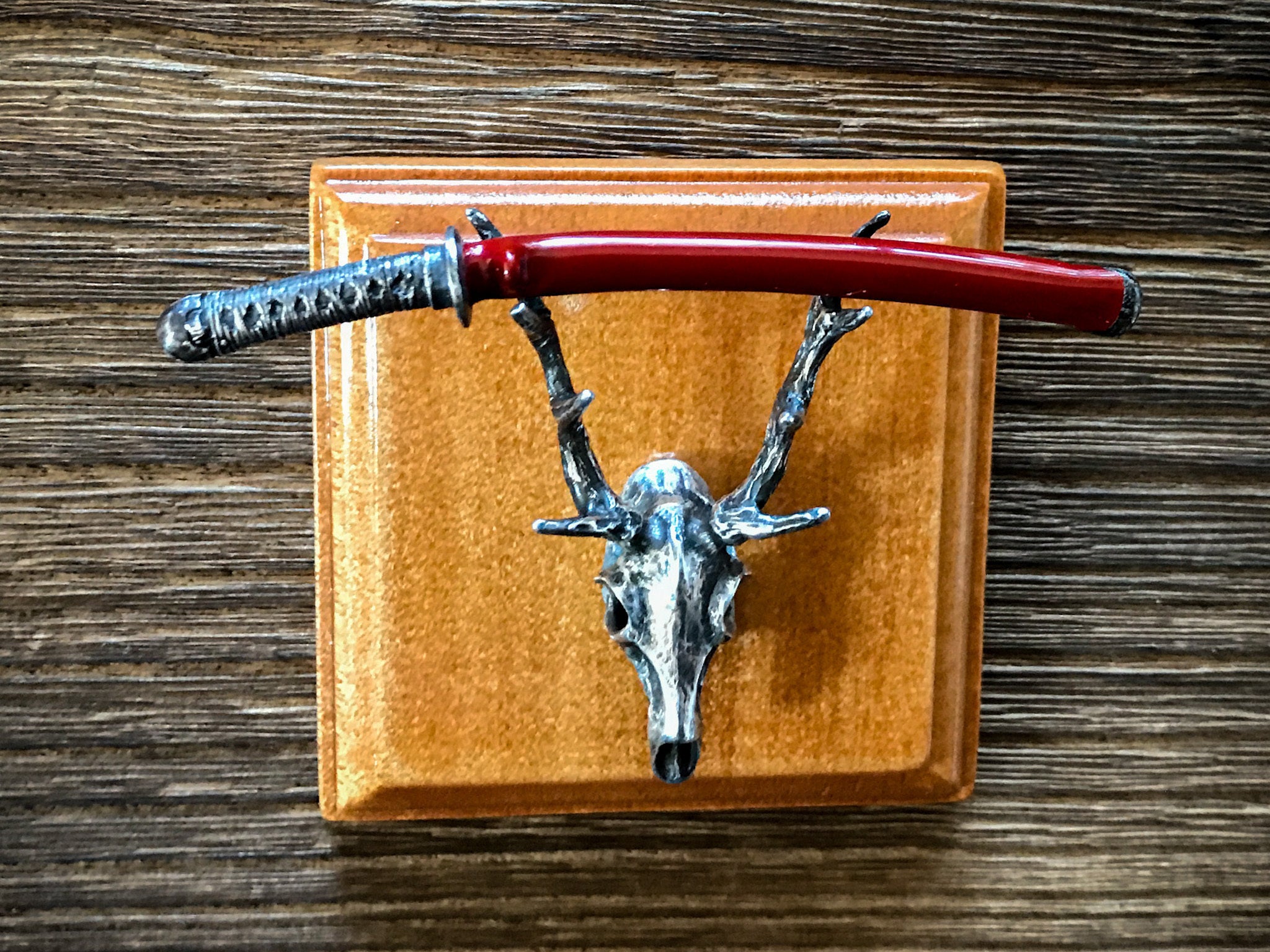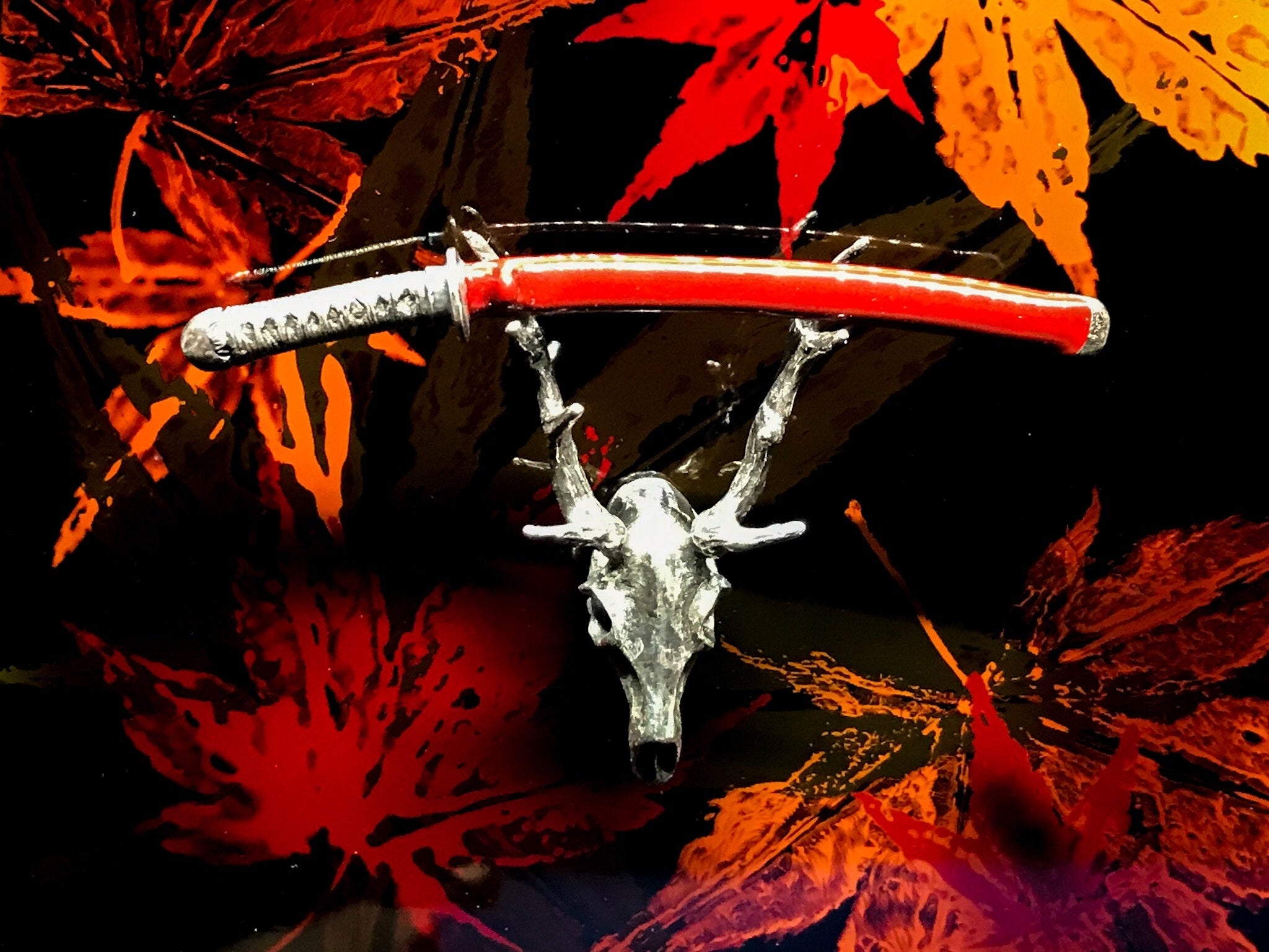 シルバー製の鹿のスカルが支えるのは日本刀。