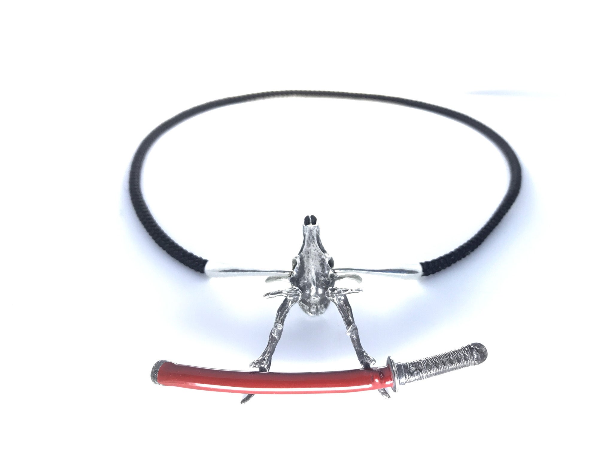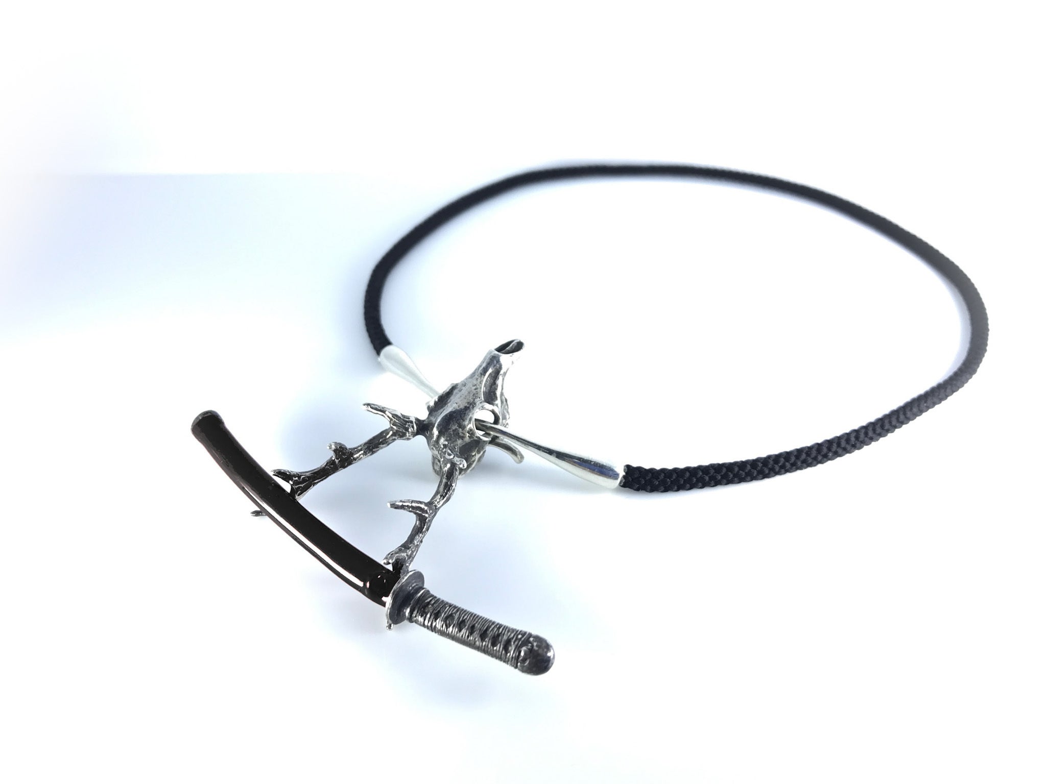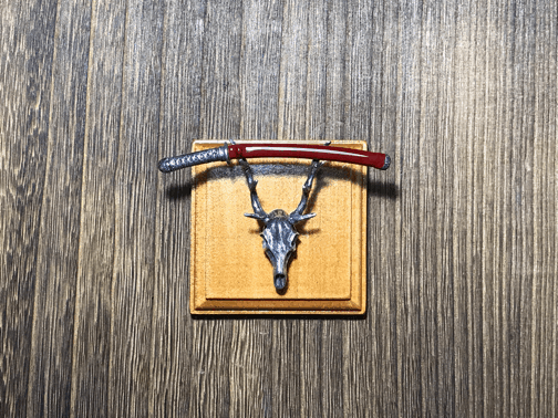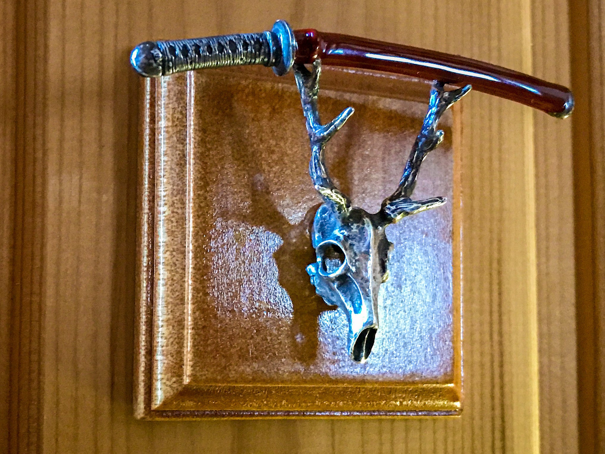 シルバー製の鹿のスカルが支えるのは日本刀。