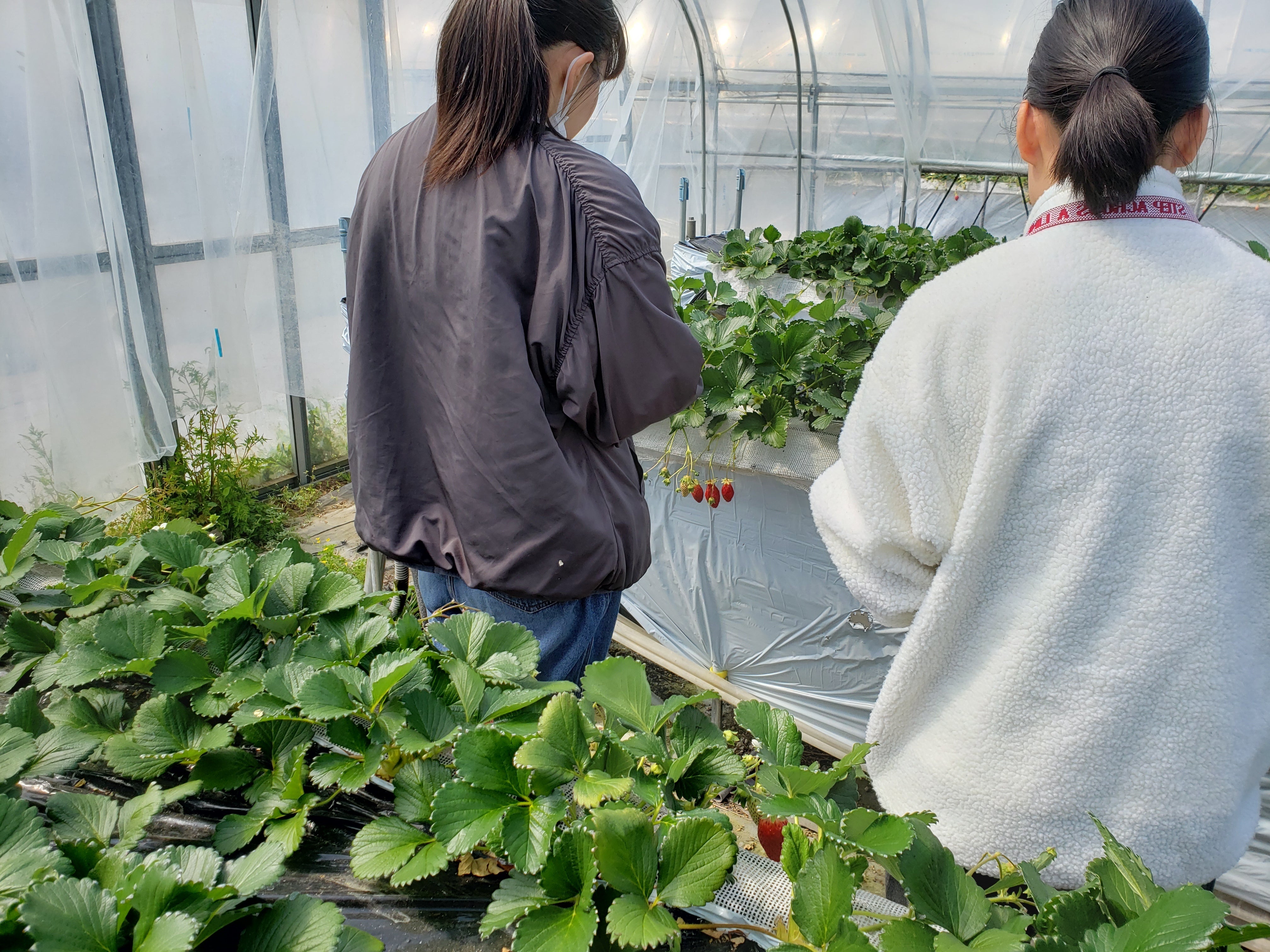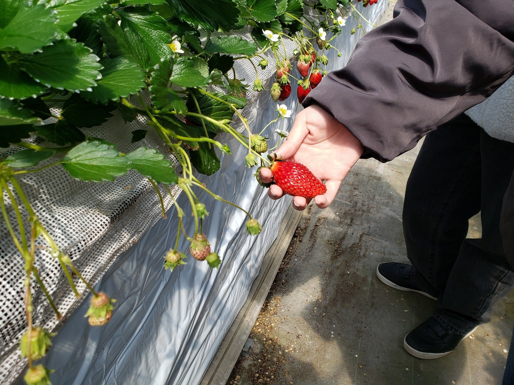 「いちご狩り」をしてもらうのも仕事の一環です。自分がお客様になってもらう事で気付くこともあると思います。