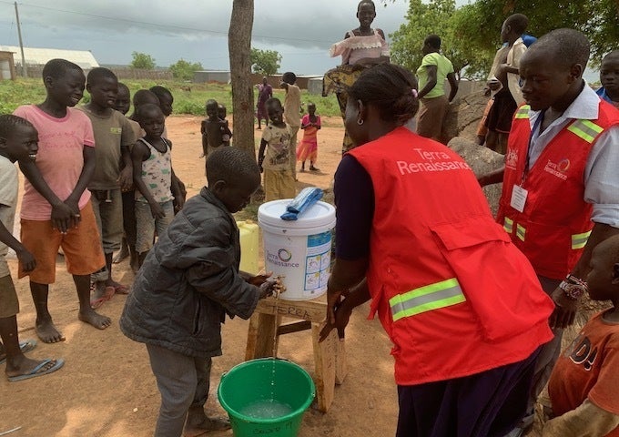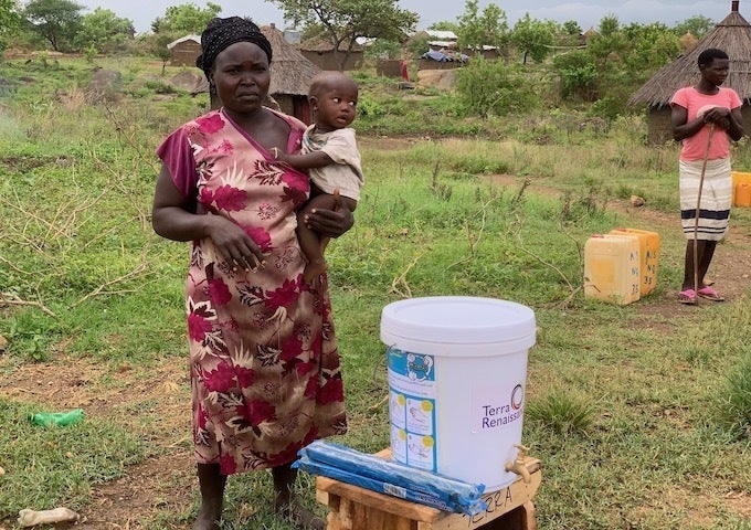 ウガンダ北部の南スーダン難民居住区でのコロナウィルス感染予防のために、手洗い設備を設置しました。