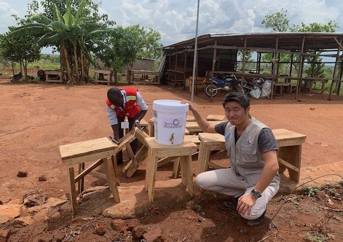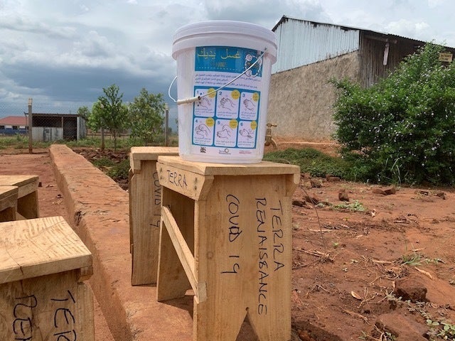 写真の簡易手洗い設備の土台は、実際に テラ・ルネッサンスの技術訓練を受けた元子ども兵、貧困層だった人々が製作したものです。(TERRA RENAISSANCE COVID19と書いてあるもの。)
