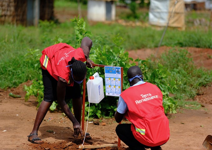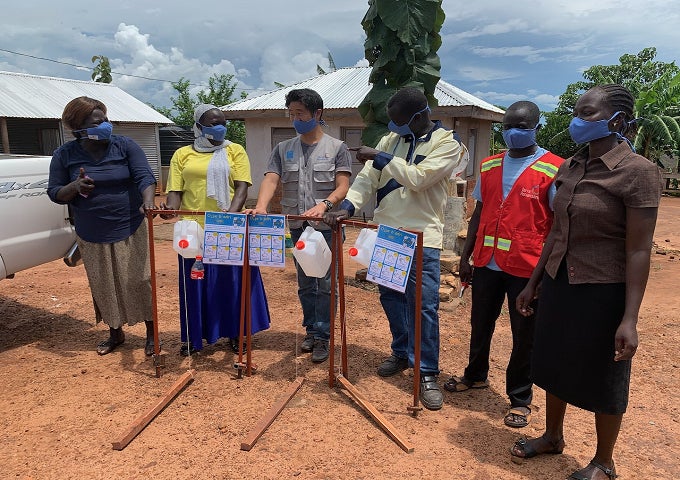 写真:現地スタッフが難民居住区に足踏み手洗い設備を設置する様子