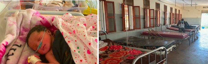 写真:マラリアやその他の感染症で重症化した人たちの病棟、入院する子どもたちの様子。