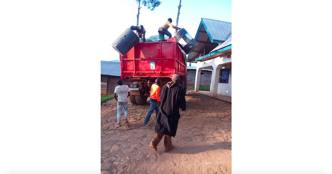 下の写真は、大型トラックで州都のブカブからカロンゲへ物資を運搬している様子です。