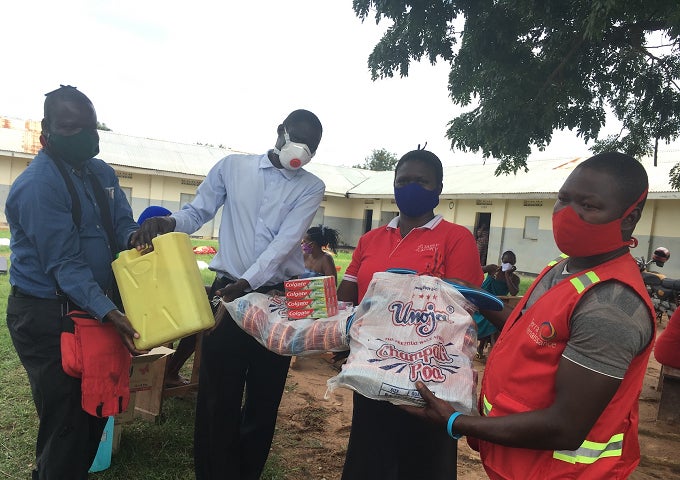 写真:隔離施設に日用品やマスクを供与する様子