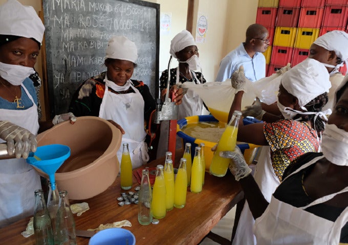 また石鹸作りの女性たちと同様、紛争被害を受けて夫や子どもを亡くしたり、国内避難民となっていた女性たちはパイナップルジュース作りと、農作物の一次加工ビジネスに取り組んでいます。彼女たちはコロナ禍で著しく収入が減りましたが、ほぼ自力で営業活動を続けながら、今も生産活動を続けています。