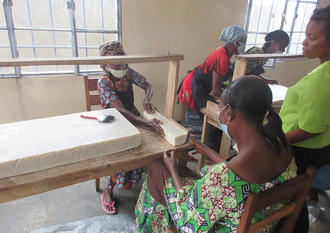 コンゴ民主共和国 中央カサイ州カナンガ市で行っている紛争被害女性の石鹸作りの様子です。