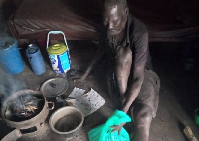 この男性は脚に障害を負って歩くのが難しい中、調理コンロ(写真左)を作って生計を立ててきました。しかしコロナにより注文が減って収入も減少し、生活が難しくなったため、緊急的に食糧や生活用品などを支援しました。