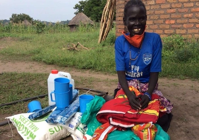 上記の男性と同様に、コロナ危機の間、モヨ県の50世帯を戸別訪問して緊急支援をしました。この女性は20代の頃に病気で両脚を失ってしまいました。今回のロックダウンで生活が苦しくなっていたため、食料、マスク、手洗い設備などを支援しました。