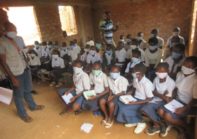 ↑紛争被害女性たちが作成したマスクを地元の小学校に配布した様子