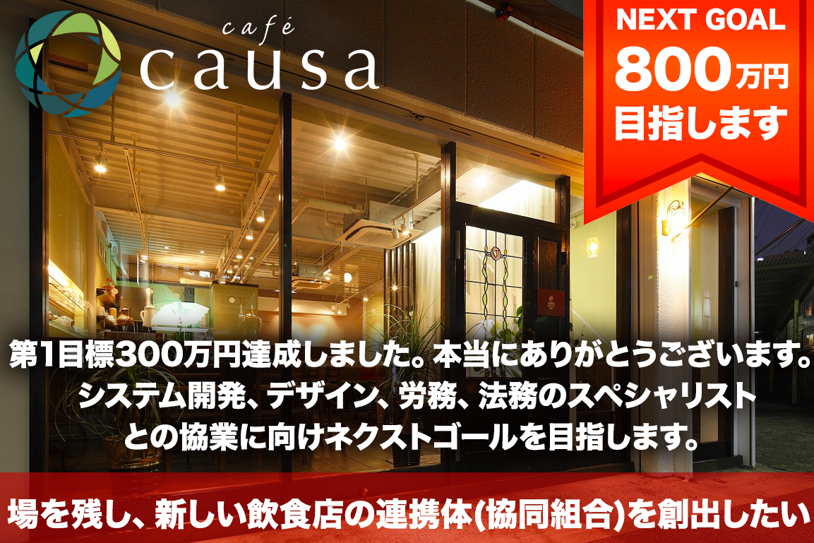 2020/05/17 16:37みなさまご支援ありがとうございます。おかげさまで目標の300万円を達成することができました。cafe causaの固定費は、家賃、人件費、光熱費・通信費(基本料)、それと借入の返済まで入れて約50万円。緊急事態宣言も解除され、時短とはいえ営業再開できましたので、今回の危機は回避できたと考えています。飲食業の業態が変化を迫られる中、本当にありがたいことです。重ねて御礼申し上げます。私自身、昼間はまちづくり会社・ゲストハウスの運営、夜は飲食店の生活を続けてきたのですが、4月の休業にあたり昼間にもう一つ仕事(緊急金融窓口相談員)を増やしており、オンラインミーティングなどの増加もあり、以前より「考える時間」を減らしてしまっています。飲酒量が劇的に減っていますし体調は万全、でもちょっと時間がない状況です。そんな中「新しい連携(協同組合、バーチャルな自治体)」については、常に頭の隅に置き、いつも考えています。現在、決めていることは組織名:coorperations法人形態:協同組合or一般社団法人発起人:北九州3名、その他エリア2〜3名で調整予定設立日:2020.07.07主旨(キーワード案)当たり前のことを当たり前にできる社会にするために。人、物、お金、情報、時間、いろんな組合せの共有で実現できるのではないか。目的は生きること、働くことは手段。組織の大小、種類、数、選択肢はいろいろ。どこに住んでも、どこで働いてもいい。お金を基準にし過ぎたのかもしれない。飲食店をきっかけとして、ポスト資本主義社会過渡期におけるバランスの取れた「個人の生き方の選択肢をふやす」ための連携体を目指します。(メインフレームが簡単に変わるとは思っていませんが、象徴として)非正規社員の@さんは、今日はA店で働く、明日はB店、社会保障はcoorperationsが担っている。cooperationsに加盟する個人事業主デザイナーは、A店のメニュー表をデザインし、フィーはcooperations経由の現金or加盟店の提供サービス(飲食、エネルギー、住宅、、)から選択。cooperationsは、エネルギー、保険、不動産、情報インフラなどとの団体契約があり、会員は会員価格で利用できる。楽天カードとバーチャルな自治体(大きすぎない協同組合)が手を結ぶ感じと言いましょうか。*ネクストゴールを高く設定しましたのは、立ち上げの仲間を募るためでした。焦らず進めていこうと思います。cafe causaを作るときも「駅裏のビジネス街で二階がお金を生まない飲食店なんて」と言われて逆に成功を確信したものです。今回は「できそうだね」の期待に対して「モデル」を明確に示せていませんが、「雇用形態」とか「住民登録」あたりを突破口に進めたいと思います。 もっと見る