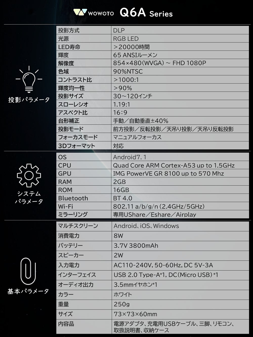wowoto Q6A Seriesは、一台でプロジェクターからTV・PCモニター、シアタースクリーン