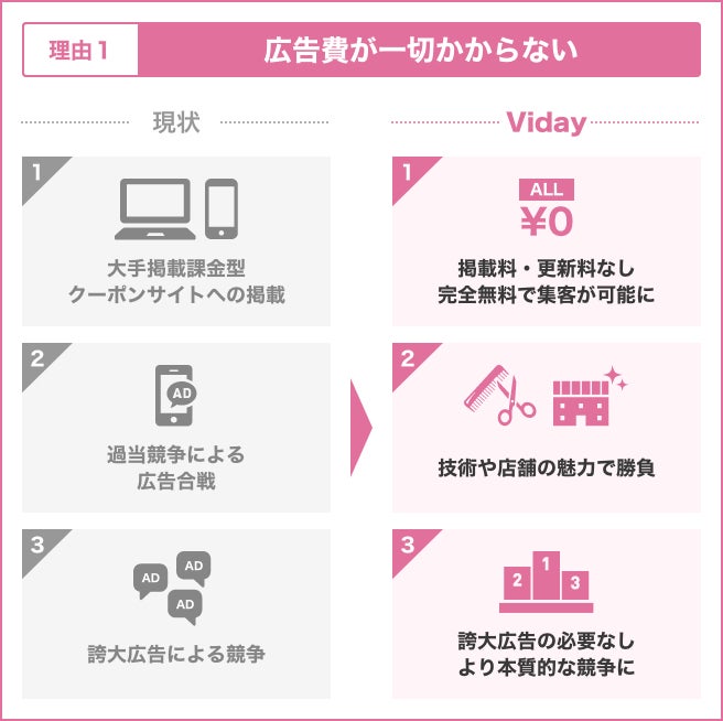 美容店舗様は『Viday』に特別メニューを掲載するだけで、コスト0円で集客することが可能になります。