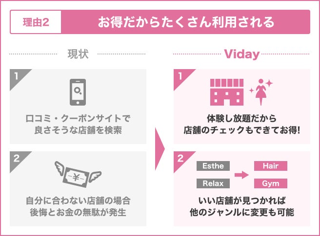 その点、Vidayなら体験し放題なので、しっかりと店舗で施術を体験することができ、ノーリスクで店舗を試せるので無駄な費用がゼロに近づきます。