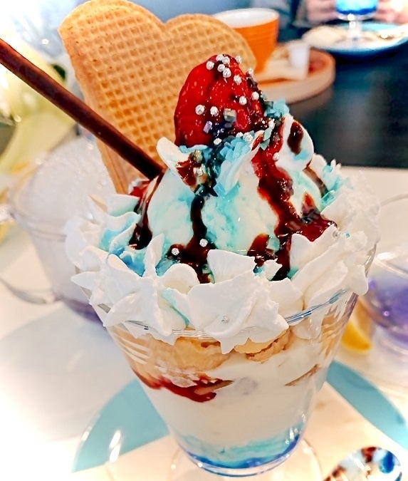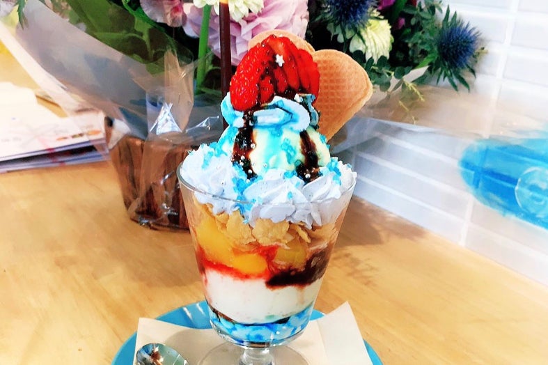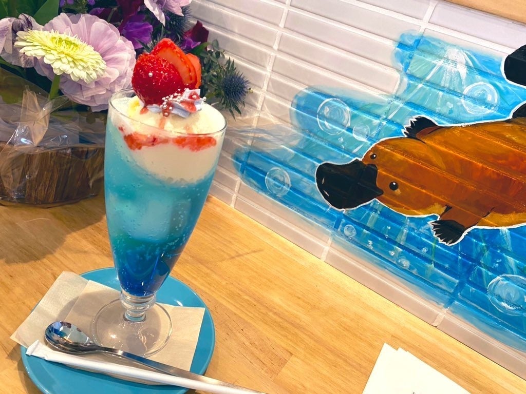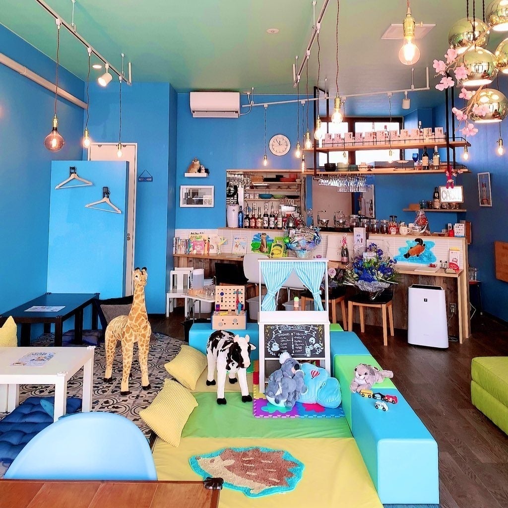 青色が大好きなオーナーこだわりの爽やかな青色が素敵な店内、ドリンクやデザートにもキラキラワクワクの要素が沢山!
