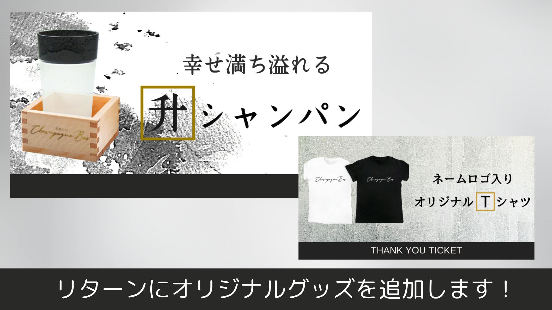 そのシャンパンをグラスから溢れさせ、升一杯に注ぐことで「幸せが溢れる」というイメージをして提案したリターンです。