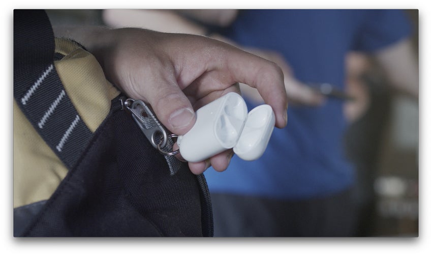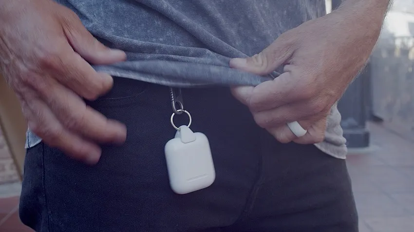 あとはJURA Anchorのカラビナを使ってベルトやバッグに取り付けるだけ。JURA Anchorがあれば、ほとんどすべてのものにAirPodsを取付けられます。