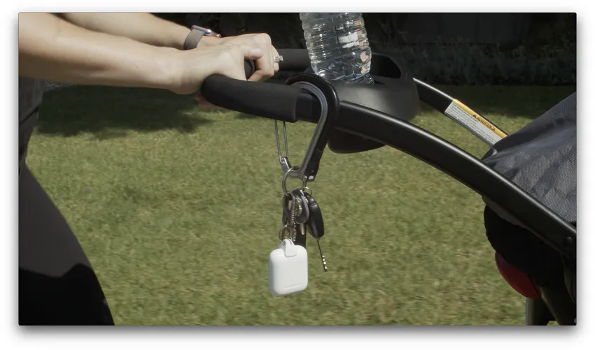 ベビーカーのハンドルに取り付けて。荷物が多いときもAirPodsは行方不明になりません。