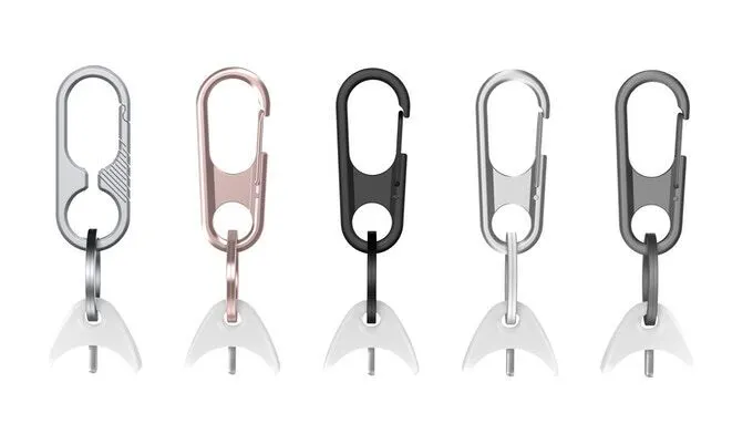 左端は高純度チタン素材の色をそのまま生かしています。あとの4つは亜鉛合金製カラビナで、左からローズゴールド、ブラック、シルバー、グレーの4色。