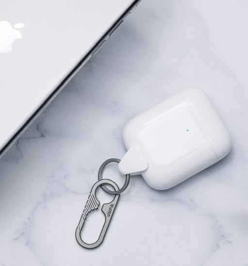 スマホで友人と通話したりポッドキャストを聴くときも、Siriに話しかけるときもAirPodsを愛用する人が増えています。でも、使いたいときに限ってAirPodsが行方不明で困ることも。小さいのでカバンの中で他の物に紛れたり、どこかに置き忘れることもありそうです。それなら、いっそAirPodsを直接身につけるか持ち歩くものにくっつけてしまおうという発想から誕生したのがAirPods専用のキャリーアダプター、JURA Anchor(ジュラ・アンカー)です。JURA社が独自に開発したカラビナ、コンポジットウィング、コネクターで構成されています。コンポジットウィングの内側にあるコネクターをAirPods充電ケースのLightningポートにカチッと差し込んでAirPodsと一体化させたら、あとはカラビナを使ってAirPodsをケースごと何にでも取り付けられます。JURA Anchorを使えば、AirPodsをどこにでも簡単に携帯できて、置忘れも防止できます。