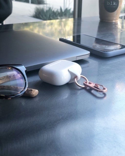 バッグのリングに取り付けて。AirPodsをバッグの中に入れないので、ワンタッチでケースから取り出せます。
