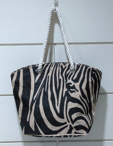 素材のベースはジュートの生成である、麻のようなベージュカラー(無漂白)。おしゃれな3色のゼブラ柄です。内側はラミネート加工を張り、完全ではありませんが撥水仕様になっています。