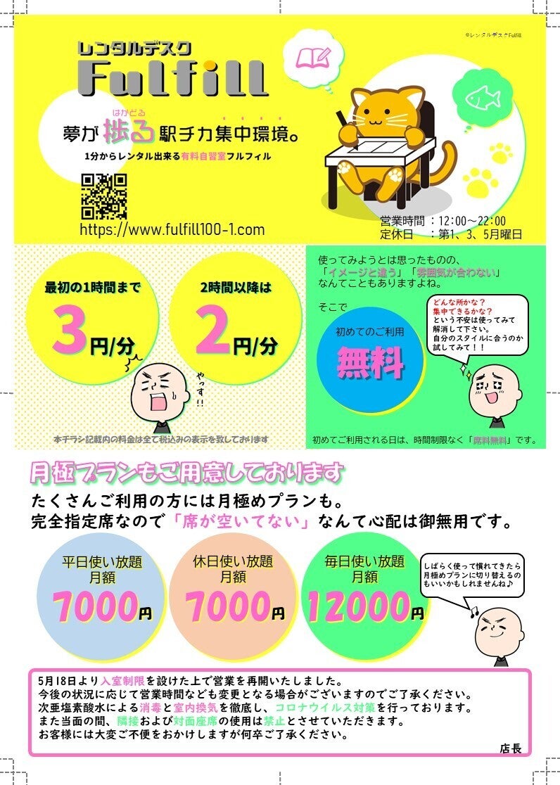 2020/05/18 17:24こんにちは、店長です。ついにクラウドファンディング最終日が今週末に迫ってまいりました。支援いただいた方、お気に入り登録いただいた方、応援メッセージくれた方、すべての方に感謝です。本日は最終日前の最後の活動報告になると思います。今日、5月18日から時短での営業を再開いたしました。開業直後から自粛を余儀なくされていたため固定のお客様はとても少ないですが、再開のお知らせをしましたところ、とても喜んでいただき今日も早速ご利用いただけました。お客様に久しぶりにお会いできたことは本当に嬉しかったです。売り上げがどうのとか、事業の継続がどうのとか、本当に些細なことだと感じています。画像は年度末に配布しようと思っていたチラシです。すでに神奈川県内では客船での蔓延があったため、自粛ムードが高まっていた時期なのでこちらもキャンセルしておりました。年度の始まりという機会は失ってしまいましたが、ようやく広告を手配できたことで周辺の皆様に認知していただけるかもしれません。この再開を新たな出発地点として、地域のお客様に根差した空間となれるように邁進してまいります。あと5日ですが、最後まで見守っていただけますようお願いいたします。レンタルデスクFulfill 店長 もっと見る