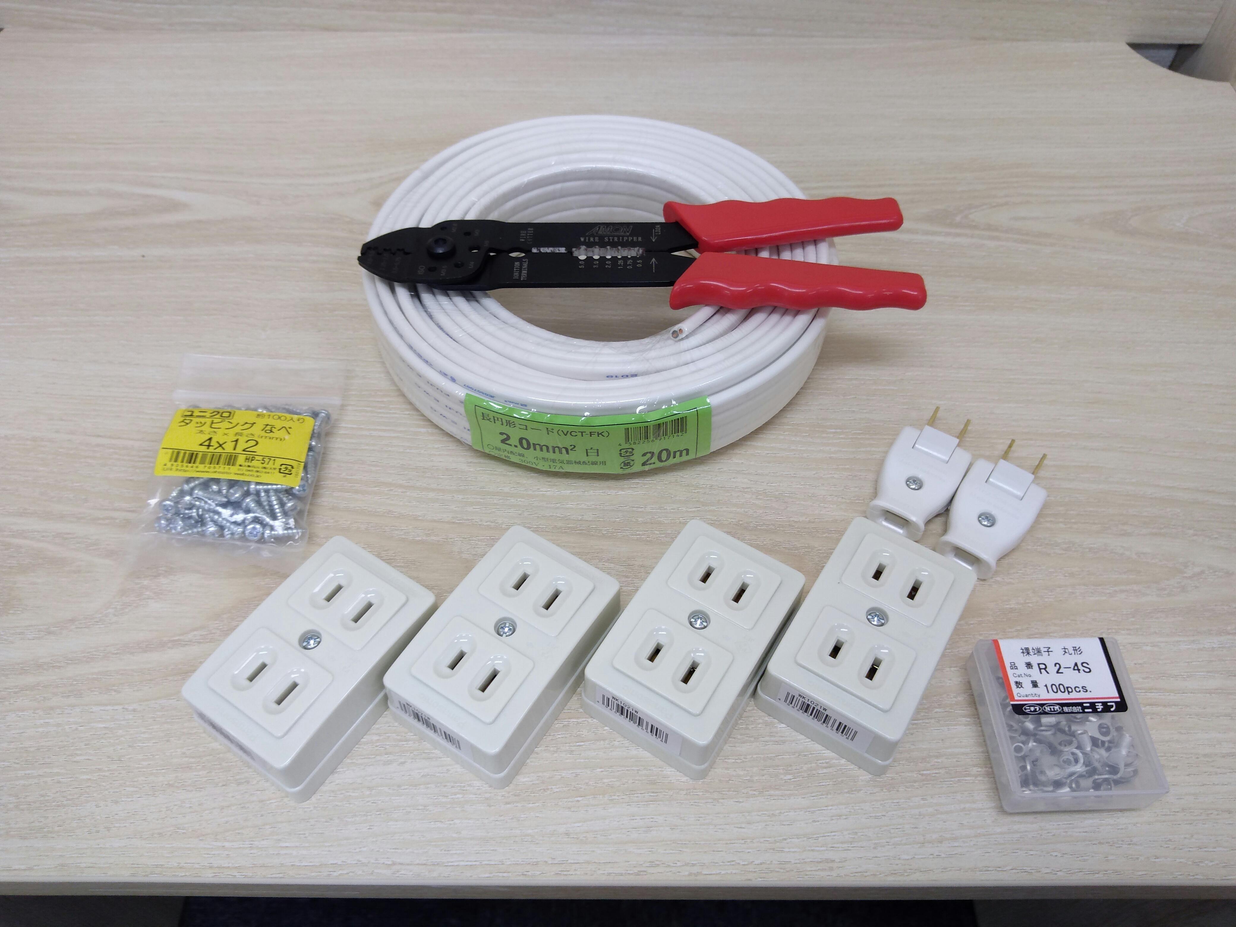 電線とコンセント部品、圧着端子とネジ、それと圧着ペンチ(自前)ですね。