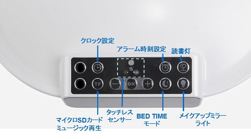 BED TIME モード ボタンを押す事により、30分後に自動的に照明、音楽再生がオフになります。ベッドサイドでお使いの際、うっかり寝てしまわれても安心です。