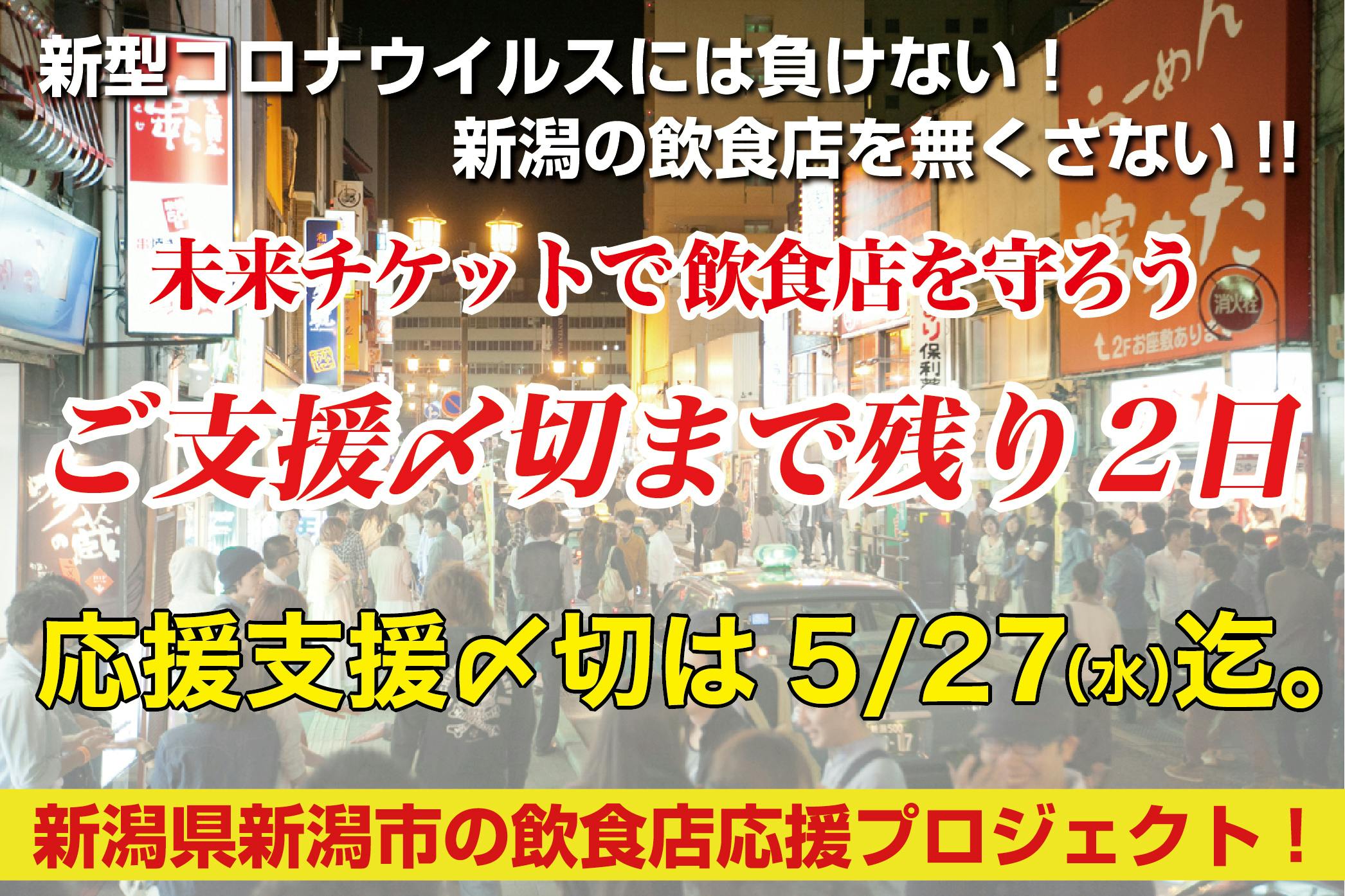 2020/05/26 18:45【終了まで残り2日】未来チケットプロジェクトの終了までのあとわずかとなりました。沢山のご支援のお陰で現時点で3,658,000円の支援が集まっております。緊急事態宣言も解除され、少しずつ良い方向に向かっているとはいえ、新潟駅周辺の飲食店舗に人出が戻ってくるのはまだまだ時間が掛かりそうです。プロジェクト終了まで残りわずかではありますが、1軒でも多くのお店に支援を宜しくお願い致します。未来チケットは購入支援で10%バックのお礼がつきます。コロナが落ち着いたら飲食店に行こうと思っている方、目に見える支援が必要なのは「今」です。ぜひ支援購入を宜しくお願い致します。未来チケットは飲食店に「応援してくれる人がいる」という希望を与える未来への光。1軒でも多くの飲食店への応援を何卒宜しくお願い致します! もっと見る