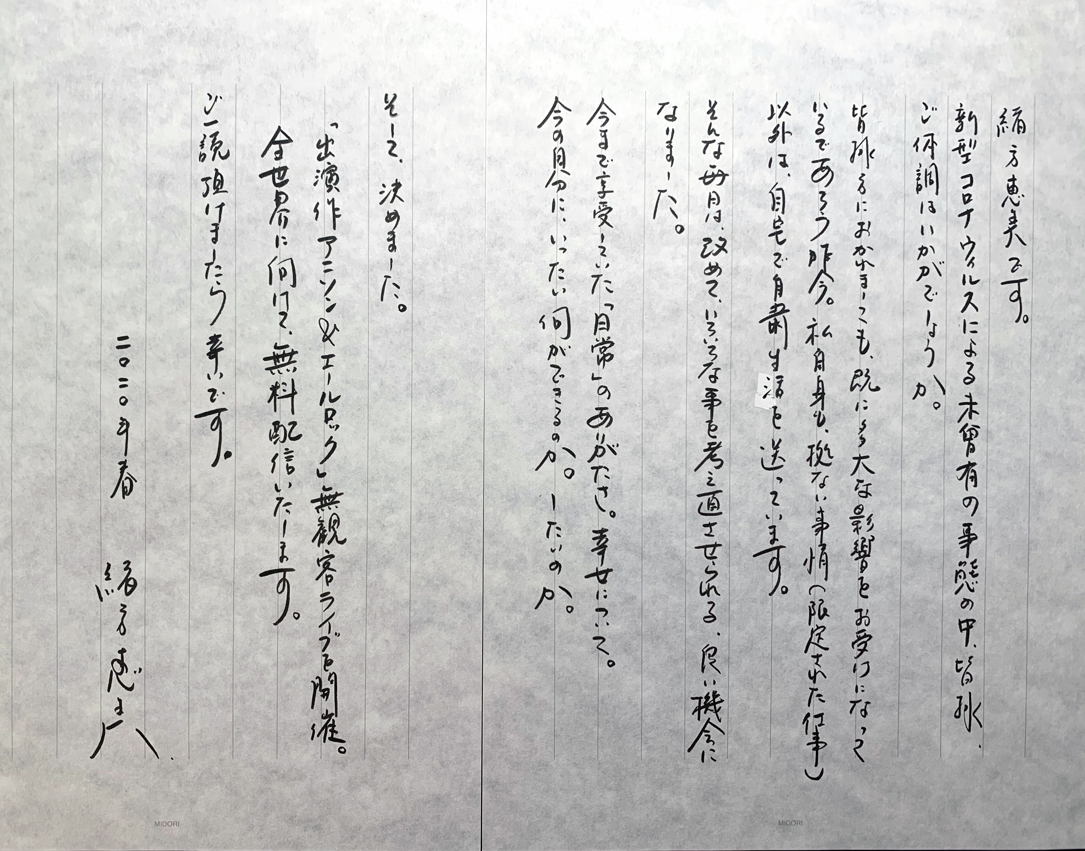 ちょうど安倍総理が最初の自粛要請をされた時、洋楽カバーライブツアー「M’s BAR」の最中で、…悩みましたがツアーを中断。その3日後に開催予定だった郡山公演を、スタジオからの「無料生配信」に切り替えました。