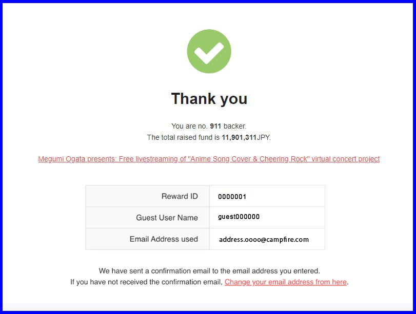 A:If you see the payment completion and receive an email in Japanese from CAMPFIRE, your payment is completed.