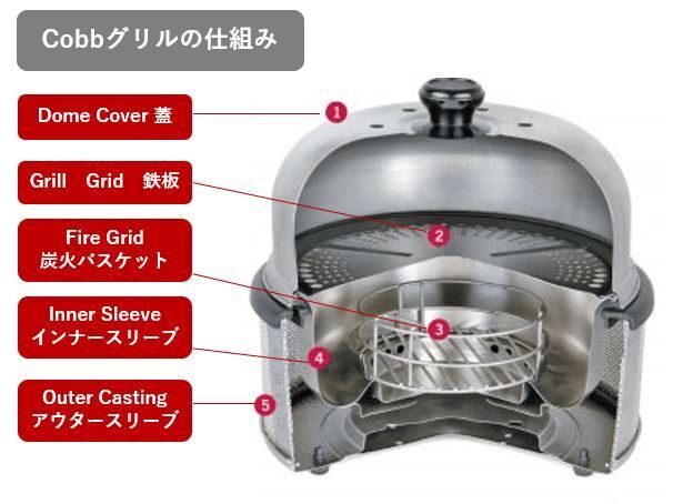 焼く、煮る、炒める、スモーク、ローストなど様々なお料理が1台できる「COBB グリル」の登場です。「コブ」とは南アフリカの田舎で開発された調理システム。コブを更に使いやすく改良して生まれたのが「COBBグリル」です。大きなドーム型の蓋を使用することでグリル内の温度を一定に保ち、少量の燃料でも充分な加熱が可能です。バーベキューやグリル料理の他に、オプションパーツを使用すれば、シチュー、パエリア、ピザなど様々な料理を作ることができます。手軽に本格的なアウトドア料理を楽しむことができます。本体の外側が熱くならない安心の2層構造になっているのでテーブルの上で出来たての焼肉やバーベキューを味わうこともできます。キャンプやピクニックなどアウトドアはもちろん、お庭やバルコニーでのホームパーティなどにも最適。スマートなデザインは楽々持ち運びができます。