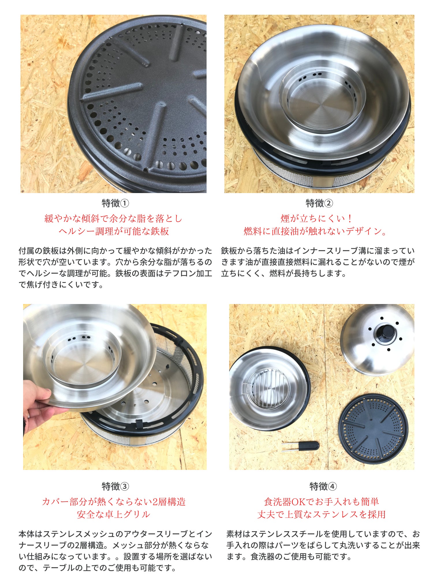 付属の鉄板は外側に向かって傾斜かかった形状で穴が空いており、お肉の余分な油が流れていく設計。余分な油を摂取せず、ヘルシーなお料理が作れます!落ちた油は燃料に触れずに溜まっていく構造で、調理中の煙が出にくいのがメリットです。これならお庭やバルコニーで使用してもご近所迷惑になりにくいデザインになっています。