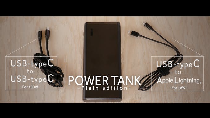「POWER TANK」は、最大100W入出力、且つ、容量20,000mAhのモバイルバッテリーが、さらに高出力対応純正ケーブル2本付きで、CAMPFIRE限定特価でゲットできます!